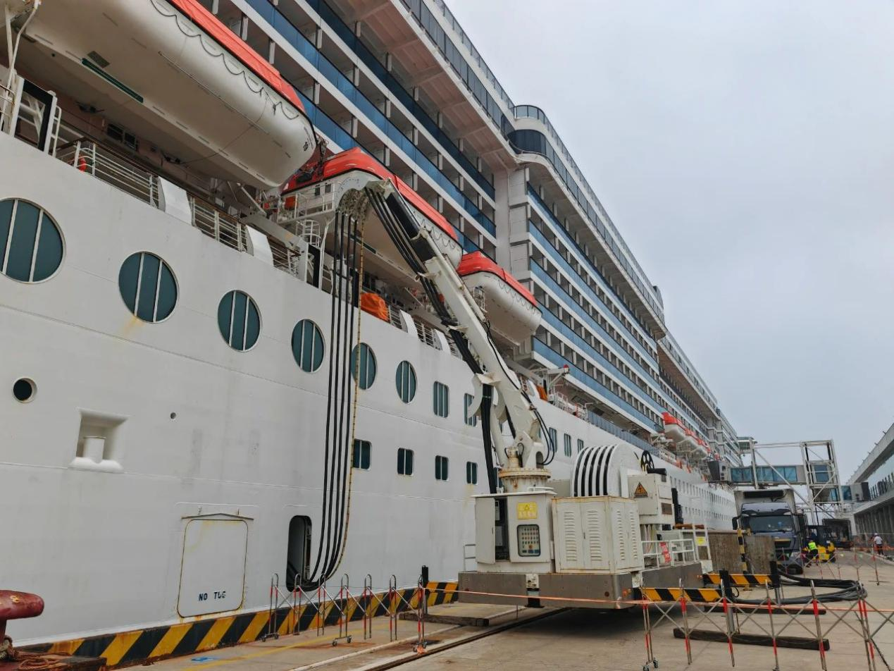 由9728太阳集团股份提供的16MVA高压岸电系统,于2023年由中国船级社质量认证有限公司(CCSC)开展连船前现场检测,完成了岸电空载运行试验、全负荷加载运行试验,取得了岸电系统检测报告和中国船级社检验证书,满足大型邮轮使用岸电的需求。本次岸电连船供电3小时,接电量达到14807kWh,减排二氧化碳3.95吨,实现了青岛邮轮母港首次岸电连船。